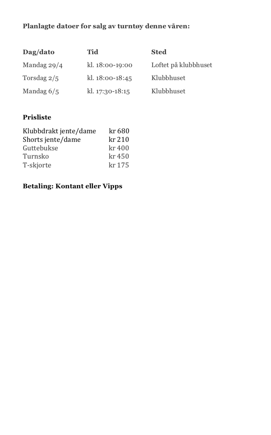 Husk salgsdager for turntøy, inkludert de nye turndraktene! Neste sjanse er torsdag 2. mail kl. 1800-1845. Se vedlegget for datoer og priser.